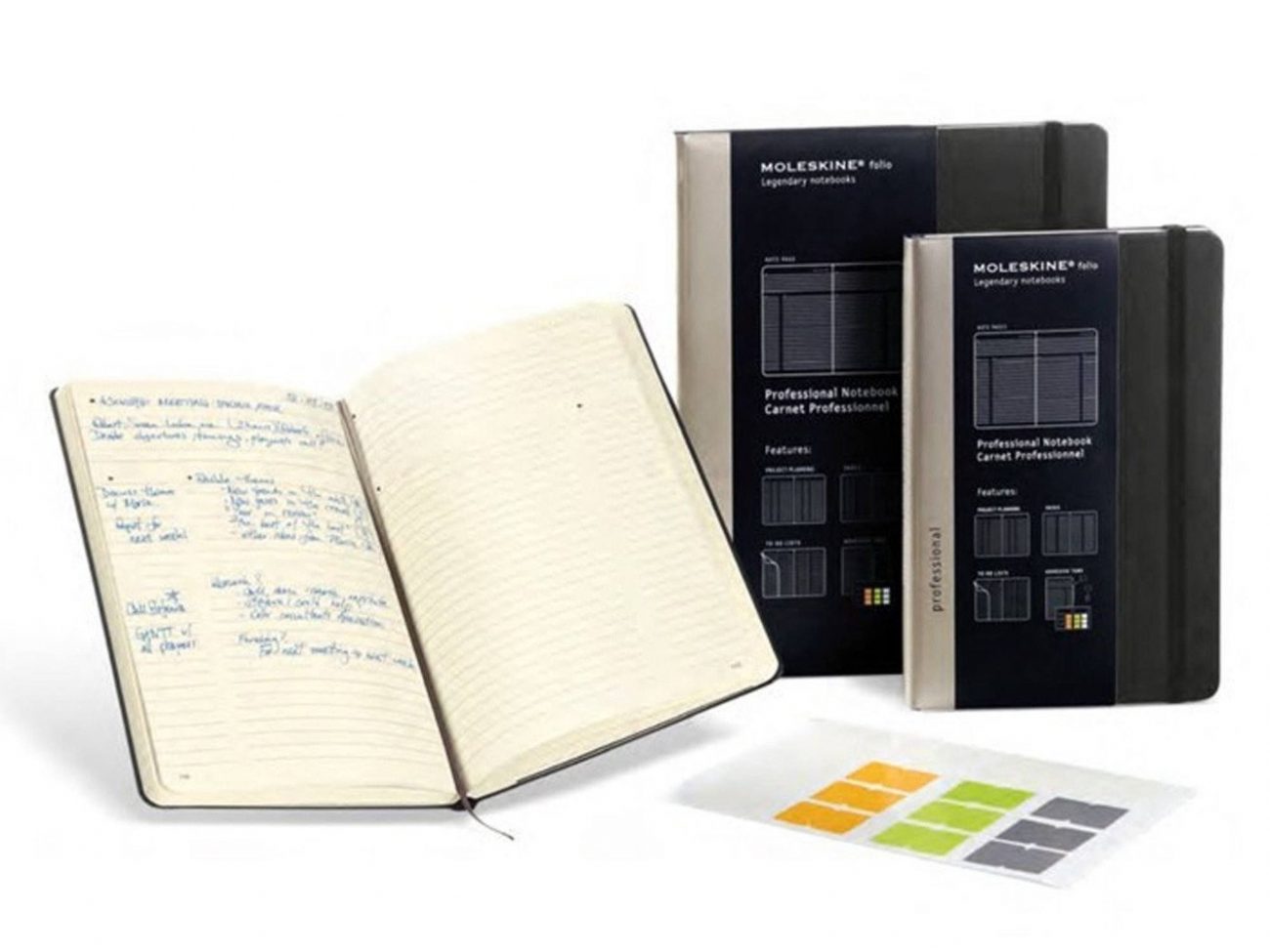 Sổ tay Moleskine Professional, cuốn sổ tay bìa da cứng có bố trí đồ họa độc đáo và đơn giản để giúp cho việc ghi chú, tổ chức, lập kế hoạch công việc. Nó được thiết kế đặc biệt dành cho các cuộc họp với các khu vực cho tên, ghi chú