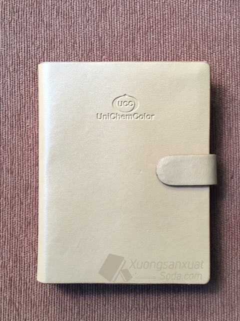Mẫu bìa da lăn sơn cạnh cao cấp được sản xuất, gia công trực tiếp tại xưởng làm sổ da Hoàng Thiên Vũ, riêng mẫu sổ da quà tặng của UniChem Color đã có 4 mẫu cho quý khách tham khảo. Mẫu bìa da này bề mặt mịn, không vân, tông màu sáng