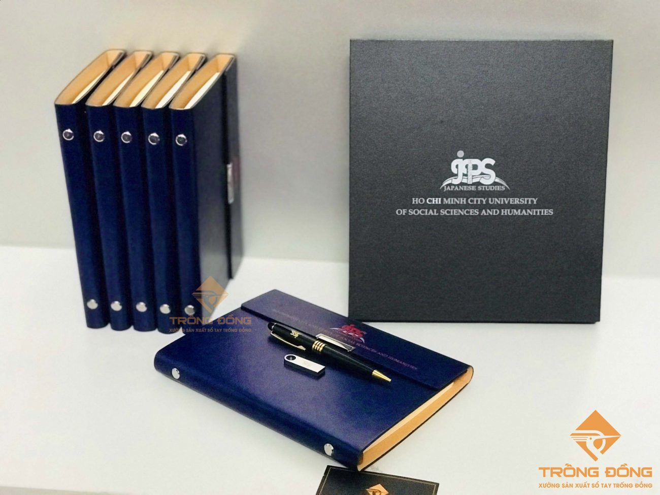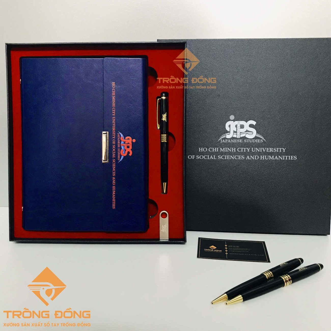 Bộ quà tặng cao cấp gồm: 01 Sổ tay bìa da pu + 01 bút kim loại + 01 hộp giấy in/khắc logo JPS theo yêu cầu của Trường Đại học Khoa học Xã hội và Nhân văn Tp.HCM.