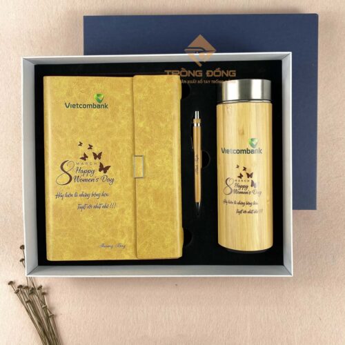 - Combo bộ 3 sản phẩm: 01 bình giữ nhiệt vỏ tre, 01 sổ da bìa còng và 01 bút gỗ tre.