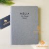 Sổ da dán gáy Meliá Ho Tram 217 được làm từ bìa da PU cao cấp có màu ghi sang trọng và thanh lịch. Phần logo được gia công ép nhiệt trên đầu bìa sổ một cách đơn giản nhưng vẫn sang trọng.