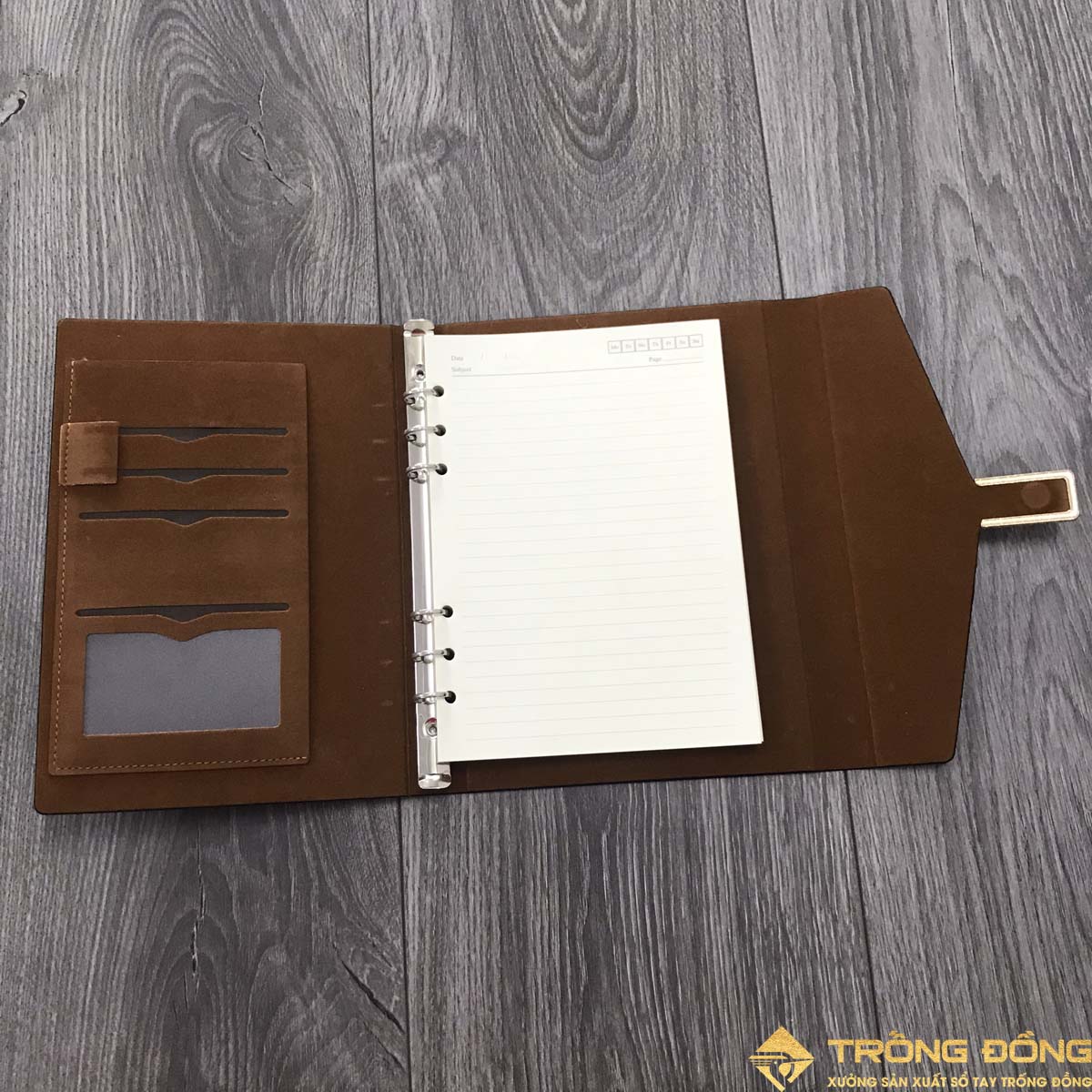 Với phần gáy sổ được sử dụng còng 6 lỗ có thể giúp bạn tháo, lắp hoặc thay thế ruột mới một cách tiện lợi. Ưu điểm của mẫu sổ bìa da có sẵn đó là có thể đáp ứng được những đơn đặt hàng có số lượng ít hoặc nhiều trong thời gian gấp rút của khách hàng. Có nhiều mẫu mã, kích thước, màu sắc, chất liệu để lựa chọn. Đồng thời, chi phí chắc chắn sẽ phù hợp với ngân sách mà bạn đề ra để đặt in logo lên sổ tay.