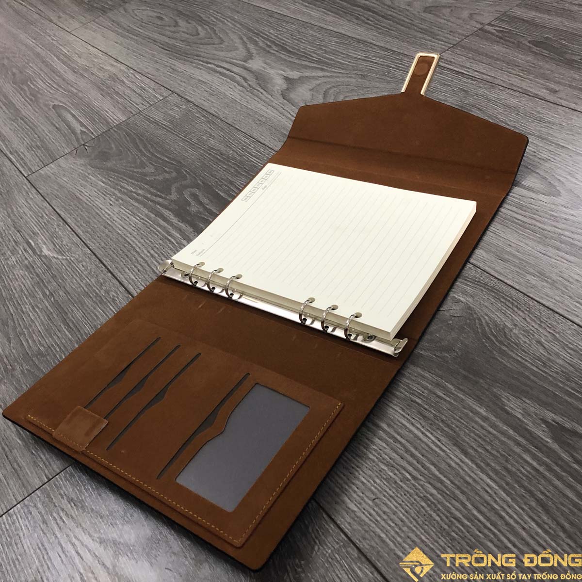 Với phần gáy sổ được sử dụng còng 6 lỗ có thể giúp bạn tháo, lắp hoặc thay thế ruột mới một cách tiện lợi. Ưu điểm của mẫu sổ bìa da có sẵn đó là có thể đáp ứng được những đơn đặt hàng có số lượng ít hoặc nhiều trong thời gian gấp rút của khách hàng. Có nhiều mẫu mã, kích thước, màu sắc, chất liệu để lựa chọn. Đồng thời, chi phí chắc chắn sẽ phù hợp với ngân sách mà bạn đề ra để đặt in logo lên sổ tay.