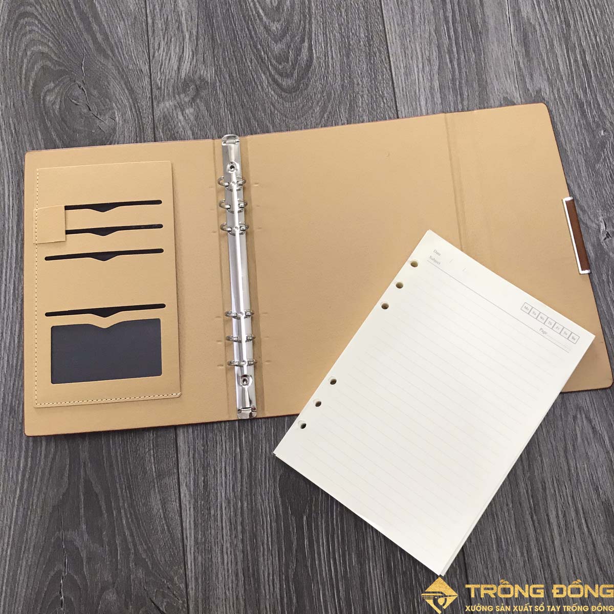 Với phần gáy sổ được sử dụng còng 6 lỗ có thể giúp bạn tháo, lắp hoặc thay thế ruột mới một cách tiện lợi. Ưu điểm của mẫu sổ bìa da có sẵn đó là có thể đáp ứng được những đơn đặt hàng có số lượng ít hoặc nhiều trong thời gian gấp rút của khách hàng. Có nhiều mẫu mã, kích thước, màu sắc, chất liệu để lựa chọn. Đồng thời, chi phí chắc chắn sẽ phù hợp với ngân sách mà bạn đề ra để đặt in logo lên sổ tay.