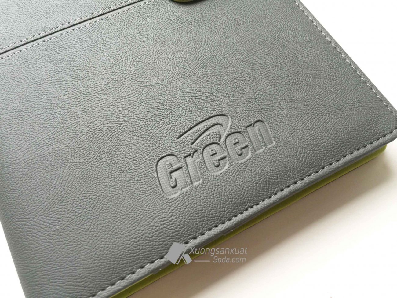 Sổ bìa da Green tông màu xám, ép nhiệt (ép lún logo 1 vị trí) ở phần cuối sổ