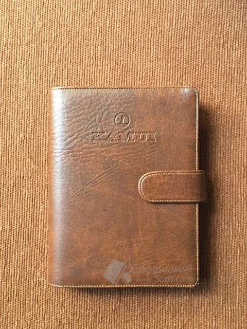 Sổ da KAMUI được sản xuất, gia công bằng bìa da Simili, còng 6 lỗ, công nghệ ép lún logo lên bìa sổ > Kiểu sổ bìa da may chỉ