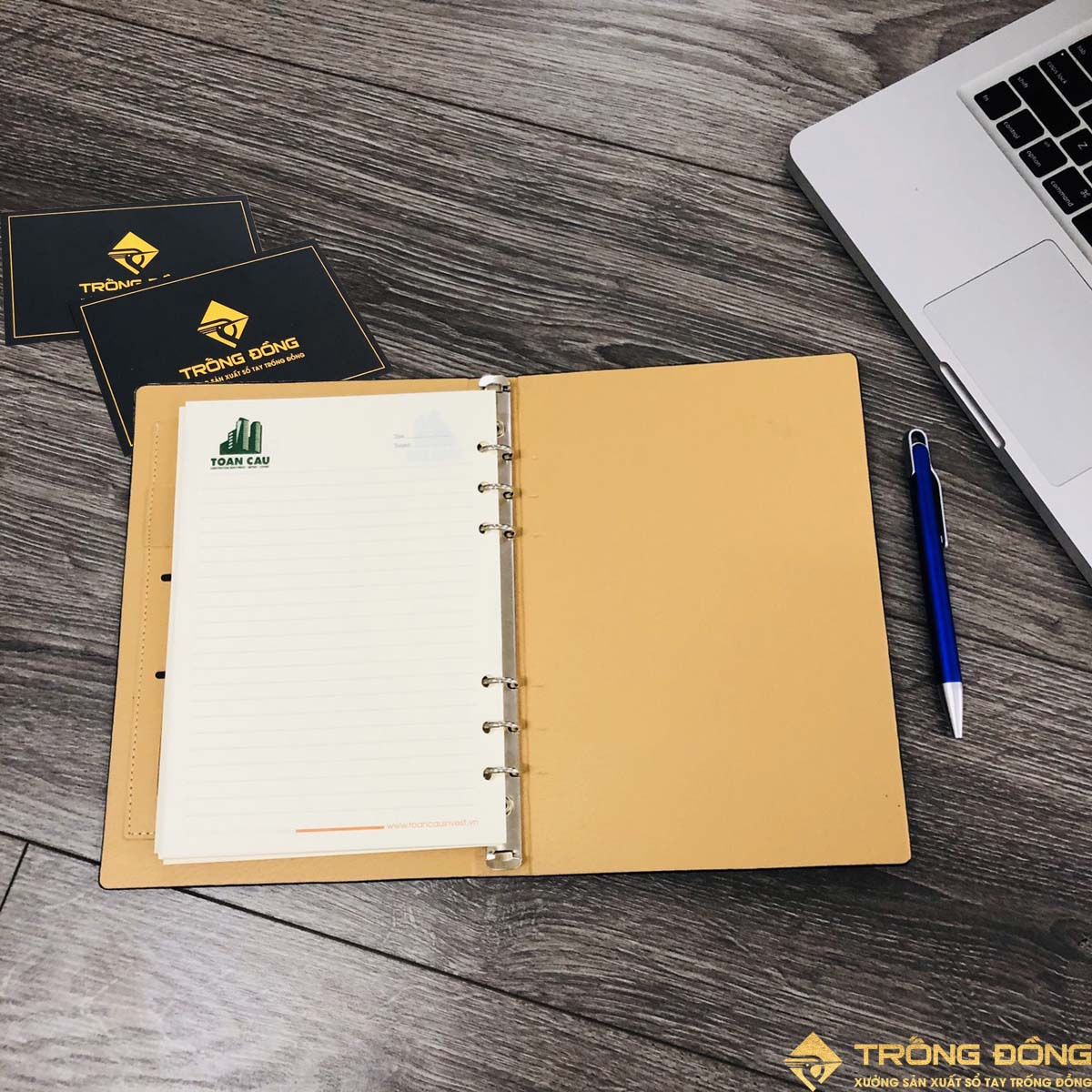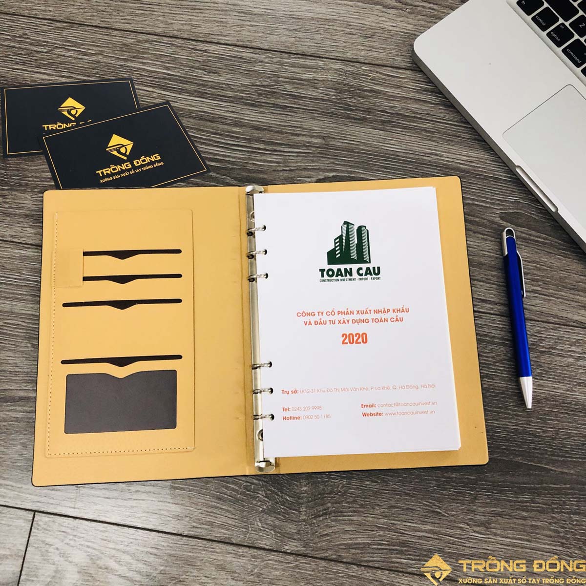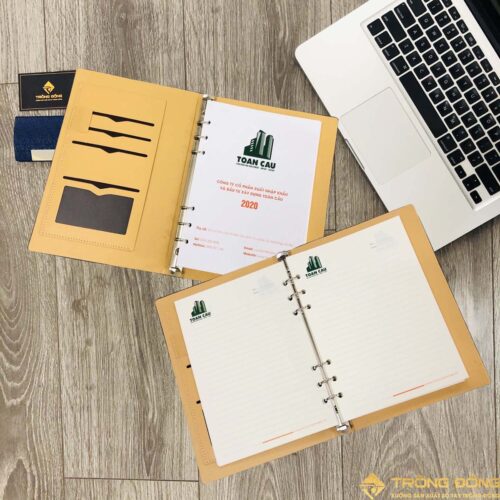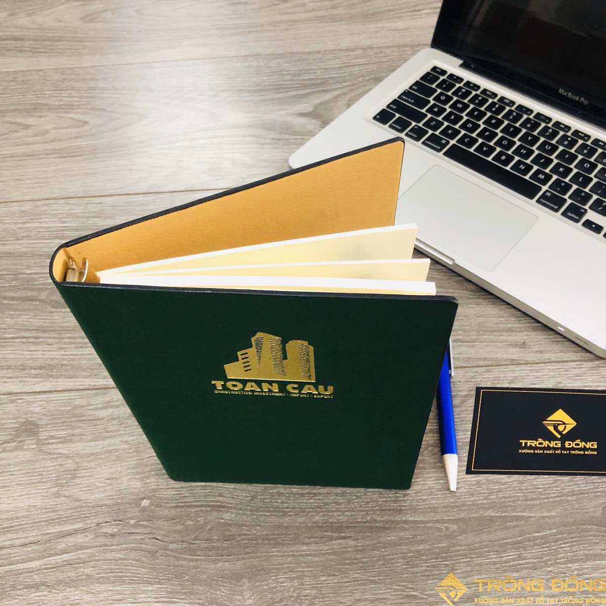 Đặc điểm và hình ảnh tham khảo sản phẩm sổ da bìa còng ép nhũ vàng logo TOÀN CẦU 209