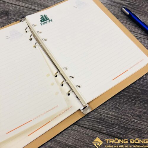 Phần ruột sổ ghi chép của sổ da bìa còng Toàn Cầu 209 được in ấn offset theo yêu cầu, với logo màu xanh và website của doanh nghiệp màu đỏ 02 mặt của trang giấy.