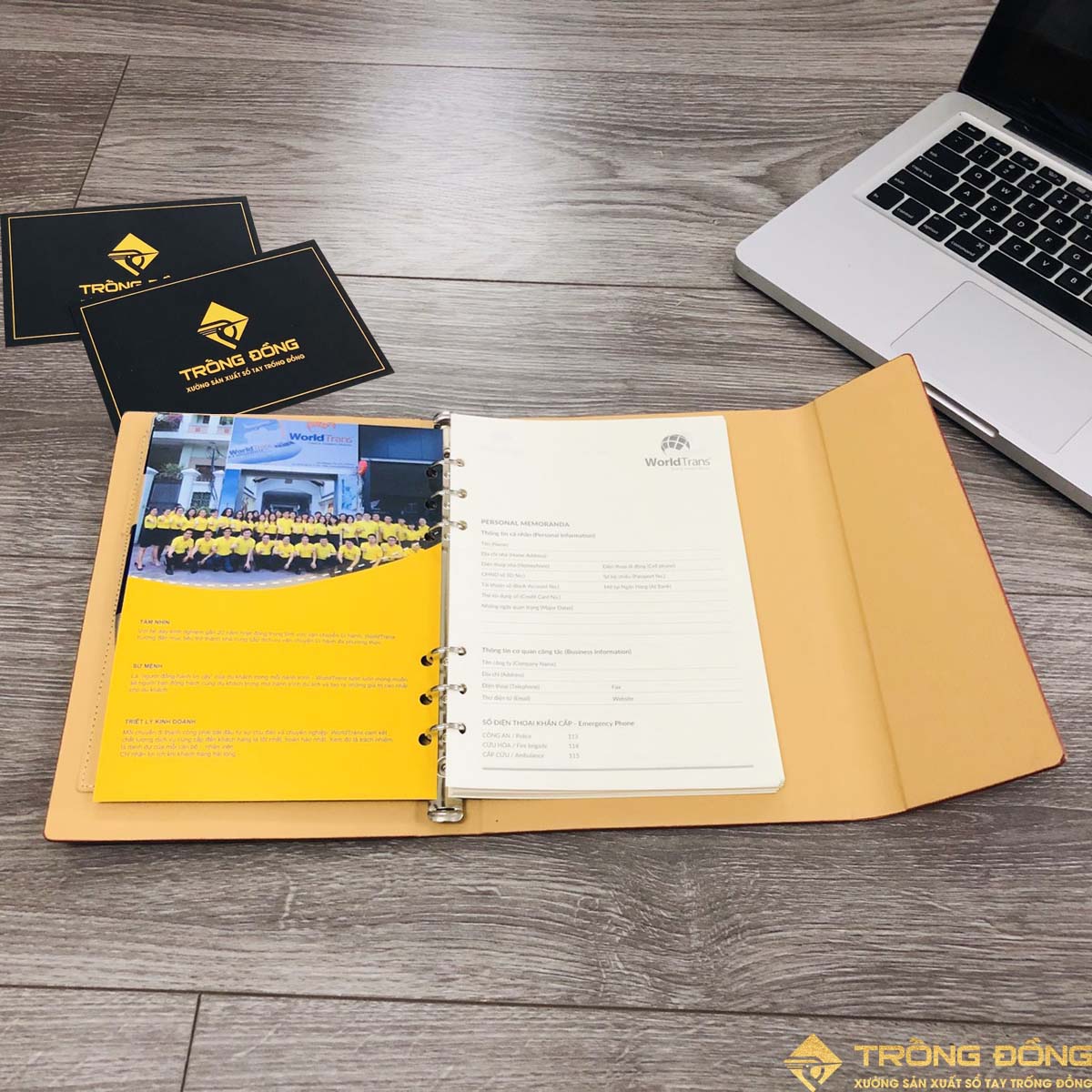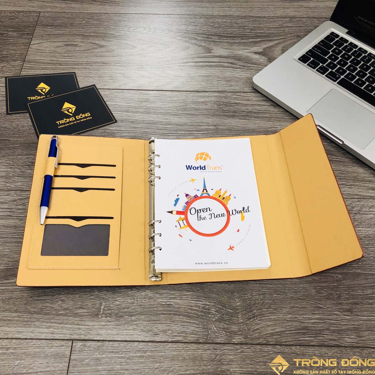 Đặc điểm và hình ảnh tham khảo sản phẩm sổ da bìa còng ép nhũ vàng logo WorldTrans 210