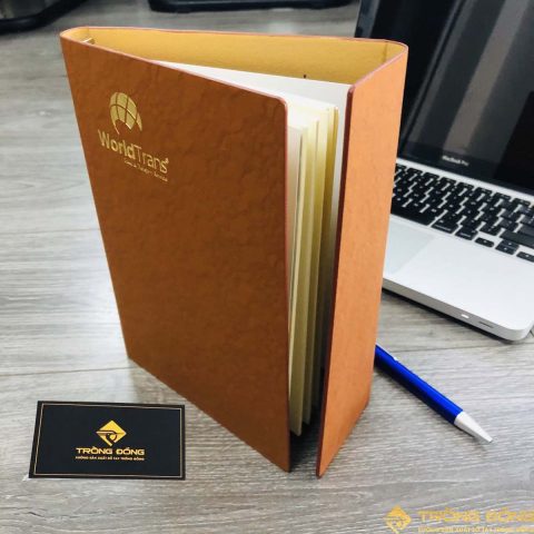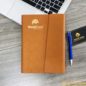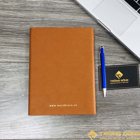 Logo và website WorldTrans của Công ty cổ phần dịch vụ vận chuyển Thế Giới được ép kim, ép nhũ vàng tại 02 vị trí (01 bìa trước, 01 bìa sau) với đường nét đẹp, tinh tế và sang trọng tạo nên cho cuốn sổ da quà tặng cao cấp cho doanh nghiệp.