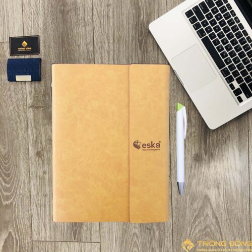 Sổ da bìa còng ép nhiệt logo ESKA 207 là mẫu sổ còng 6 lỗ da PU cao cấp, bìa da có vân độc đáo, sang trọng. Logo của Dầu nhớt ESKA SINGAPORE được ép nhiệt trên bề mặt bìa da màu vàng một cách nổi bật.