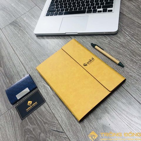 Sổ da bìa còng ép nhiệt logo ESKA 207 là mẫu sổ còng 6 lỗ da PU cao cấp, bìa da có vân độc đáo, sang trọng. Logo của Dầu nhớt ESKA SINGAPORE được ép nhiệt trên bề mặt bìa da màu vàng một cách nổi bật.