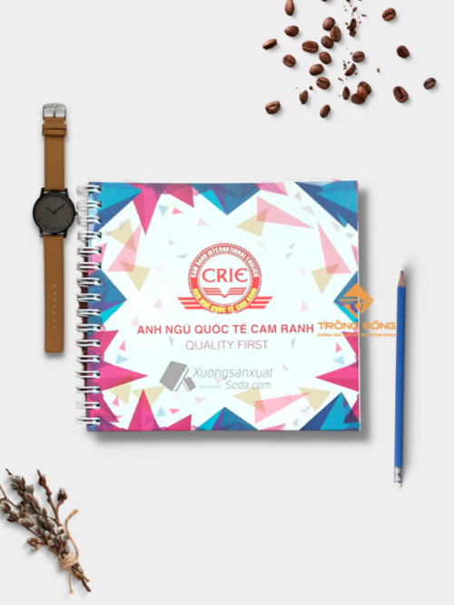 Sổ lò xo của Trung Tâm Anh Ngữ Quốc Tế Cam Ranh thiết kế rất đẹp dựa trên những ý tưởng và những nội dung mà trung tâm đã cung cấp. Sản xuất sổ tay lò xo cho trung tâm Anh Ngữ Cam Ranh với kích thước như 1 hình vuông, bên trong những trang giấy được in logo của trung tâm, làm mờ logo khi in ấn.