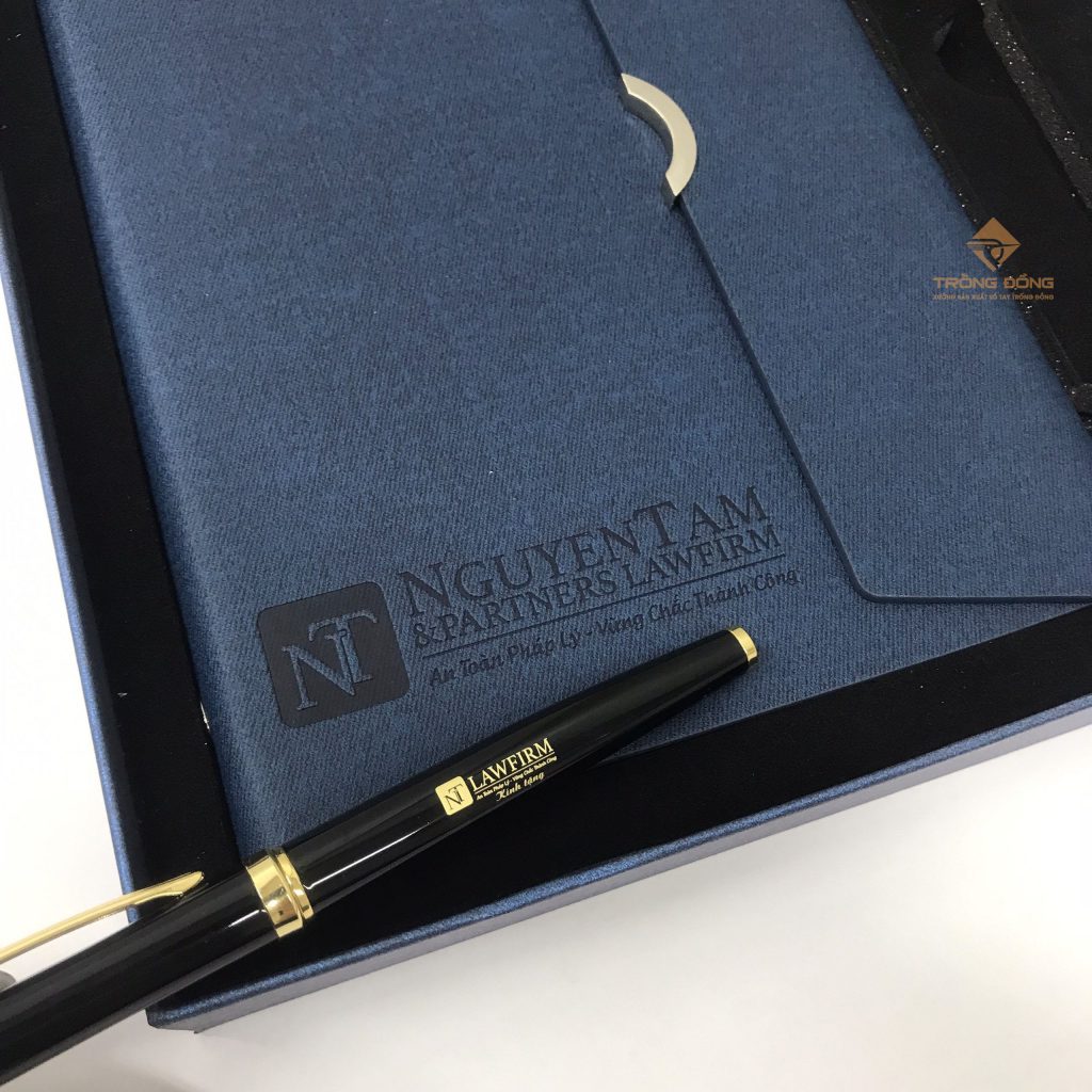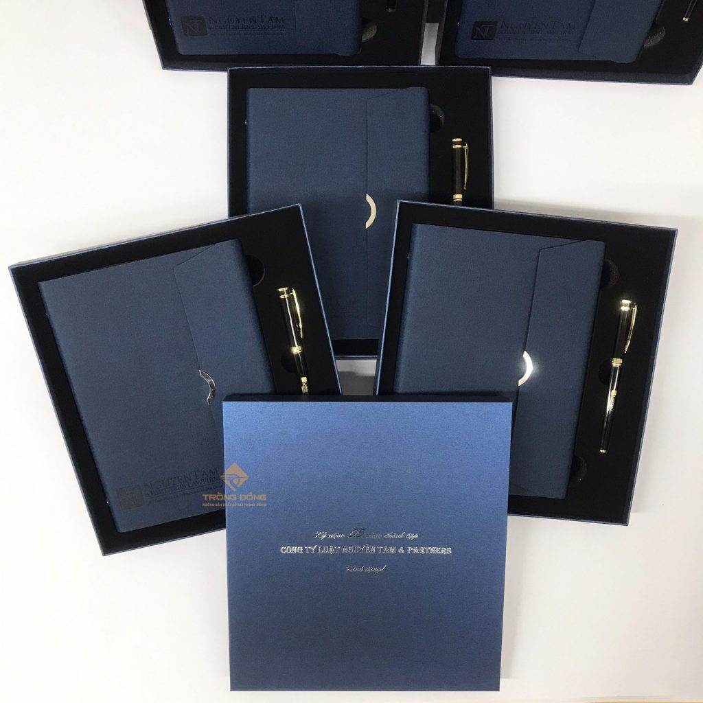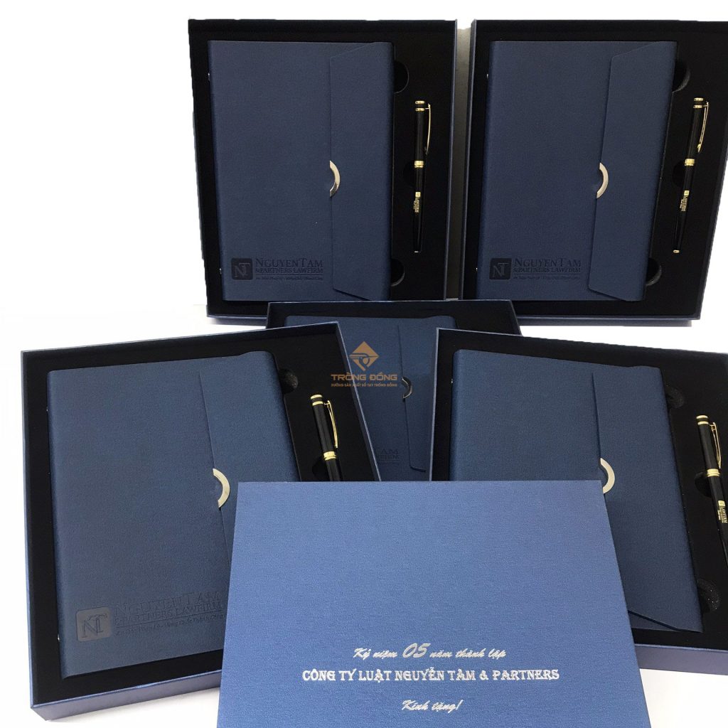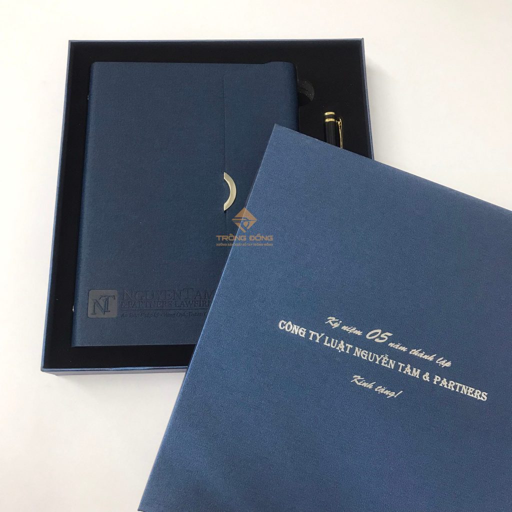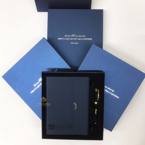 Và mẫu sổ tay Quý Công ty đã chọn là sổ da bìa còng màu xanh dương ép chìm logo phần dưới của sổ và đi kèm là với bút kim loại BK072 khoen vàng khắc logo ở thân. Đồng thời, hộp đựng bộ Giftset cũng được in nhũ bạc thông tin: “Kỷ niệm 05 năm thành lập Công ty Luật Nguyễn Tâm & Partners.”