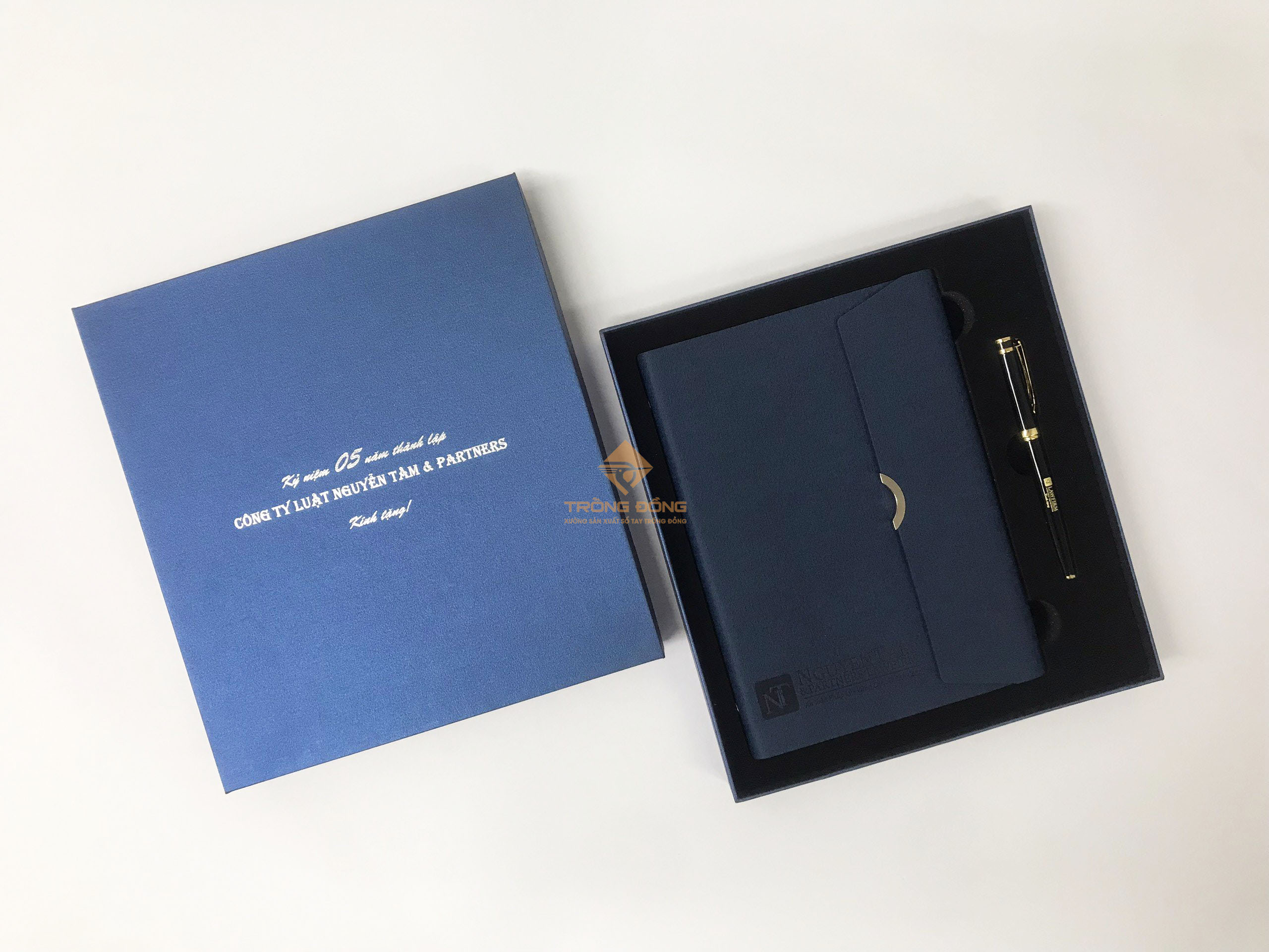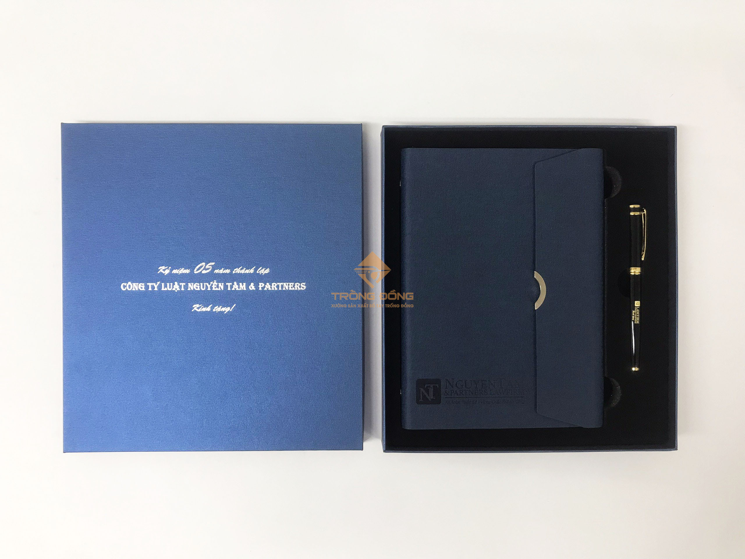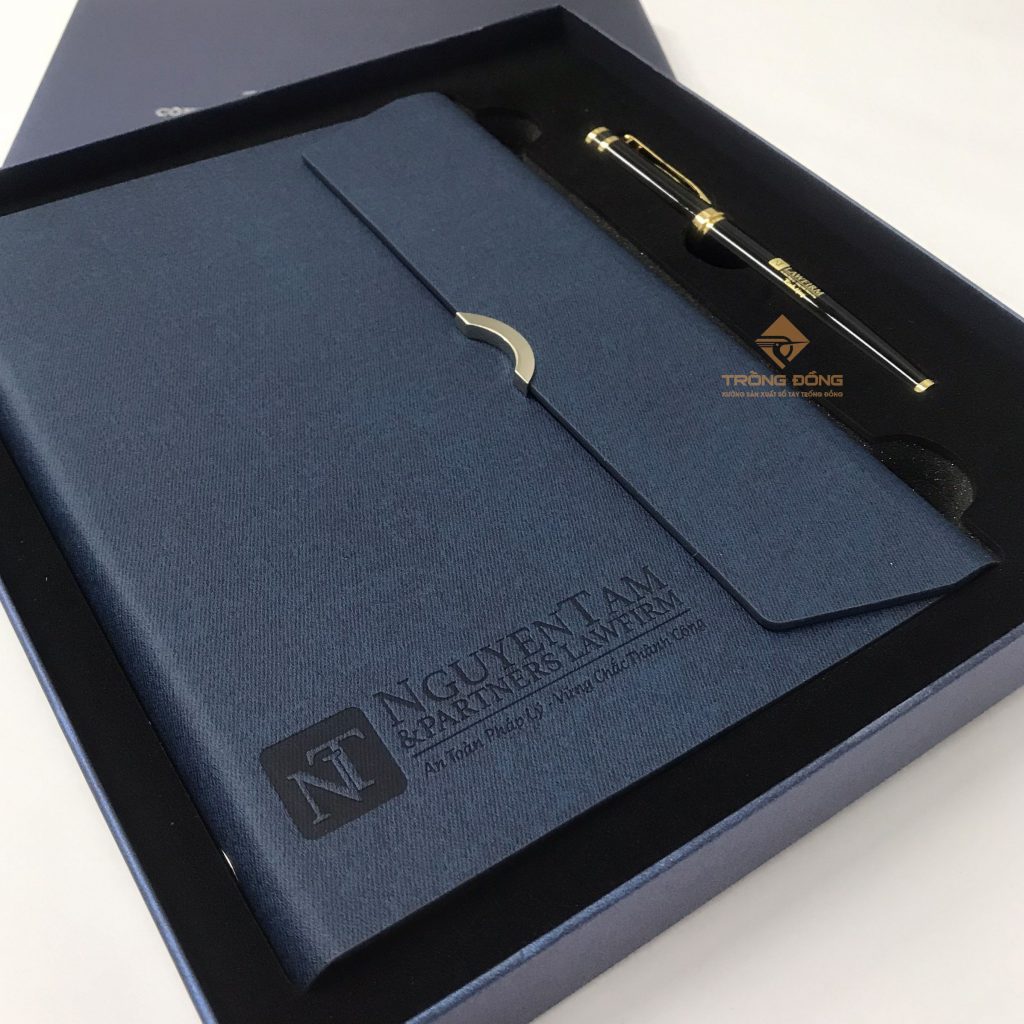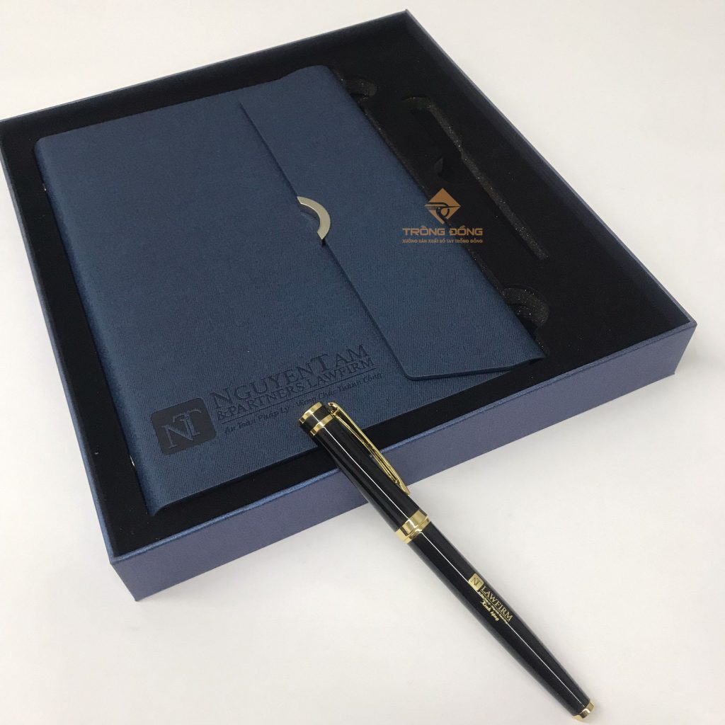 Và mẫu sổ tay Quý Công ty đã chọn là sổ da bìa còng màu xanh dương ép chìm logo phần dưới của sổ và đi kèm là với bút kim loại BK072 khoen vàng khắc logo ở thân. Đồng thời, hộp đựng bộ Giftset cũng được in nhũ bạc thông tin: “Kỷ niệm 05 năm thành lập Công ty Luật Nguyễn Tâm & Partners.”