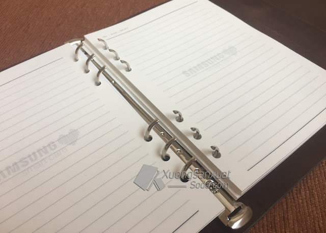 Những cuốn sổ được làm bằng kiểu bìa da lăn sơn cạnh luôn rất đẹp, sang trọng, sổ tay bìa da Samsung Smart Care dùng tông màu nhẹ nhàng, bên trong bìa có may thêm lớp nhung màu nâu, còng sổ 6 khoen (6 lỗ), 100 tờ giấy tương đương 200 trang in logo Samsung Smart Care ở giữa