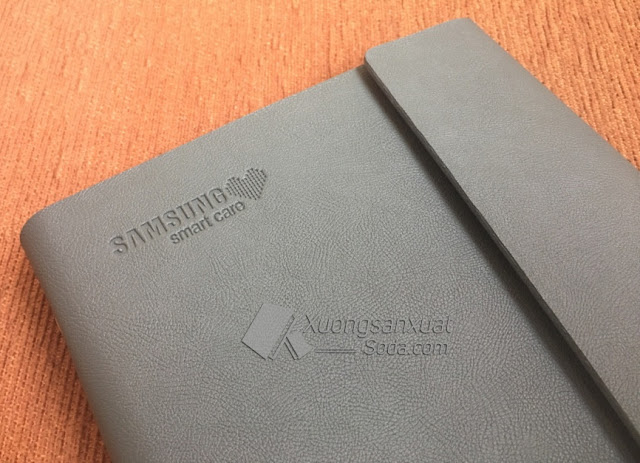Dưới đây là mẫu sổ tay bìa da Samsung Smart Care sản xuất theo yêu cầu bằng chất liệu giả da simili vân nhỏ mềm mại, sản xuất bằng công nghệ lăn sơn cạnh bìa da, kiểu sổ còng 6 khoen tai gập 2 cục nam châm 2 bên để giữ bìa sổ, dập chìm (ép nhiệt, ép nhũ) logo Samsung Smart Care phía trên bìa da