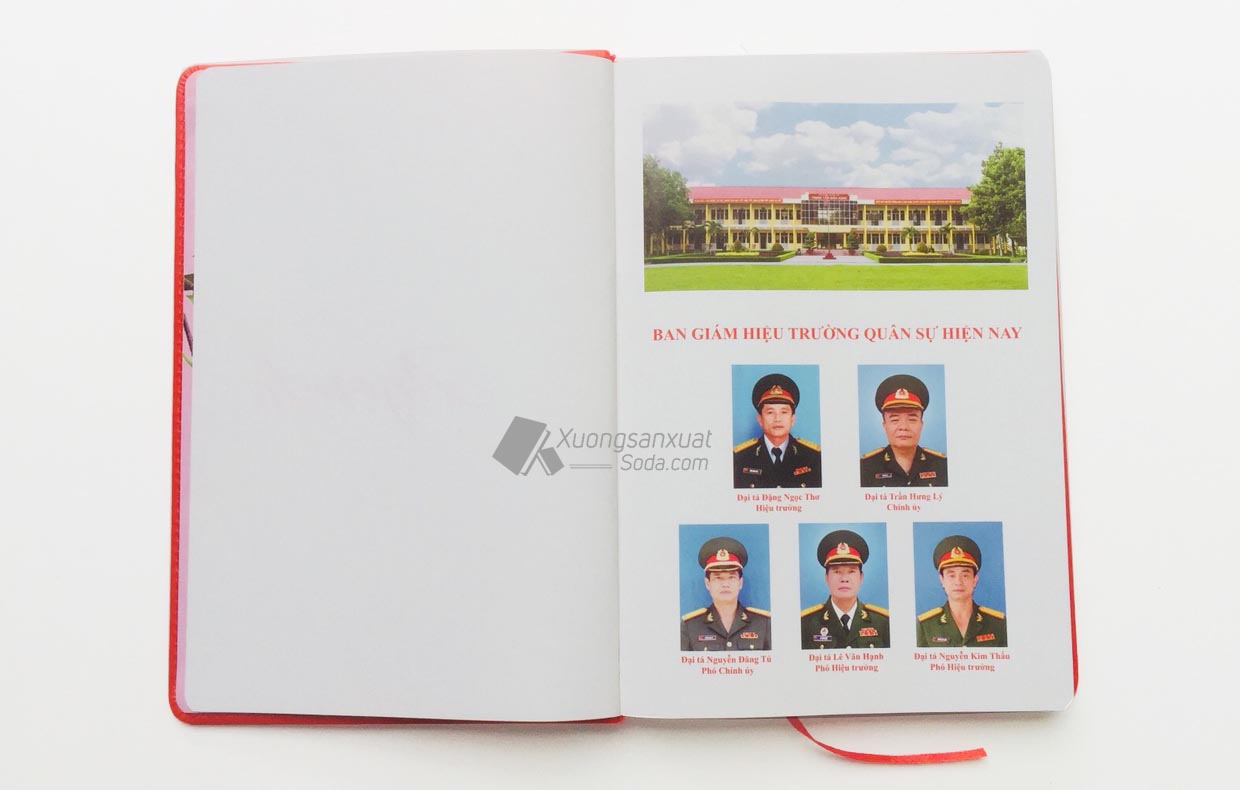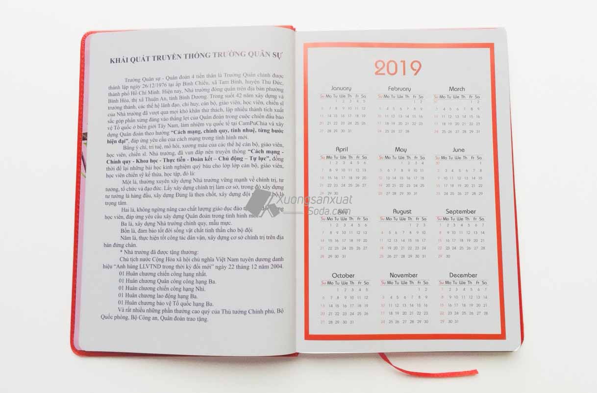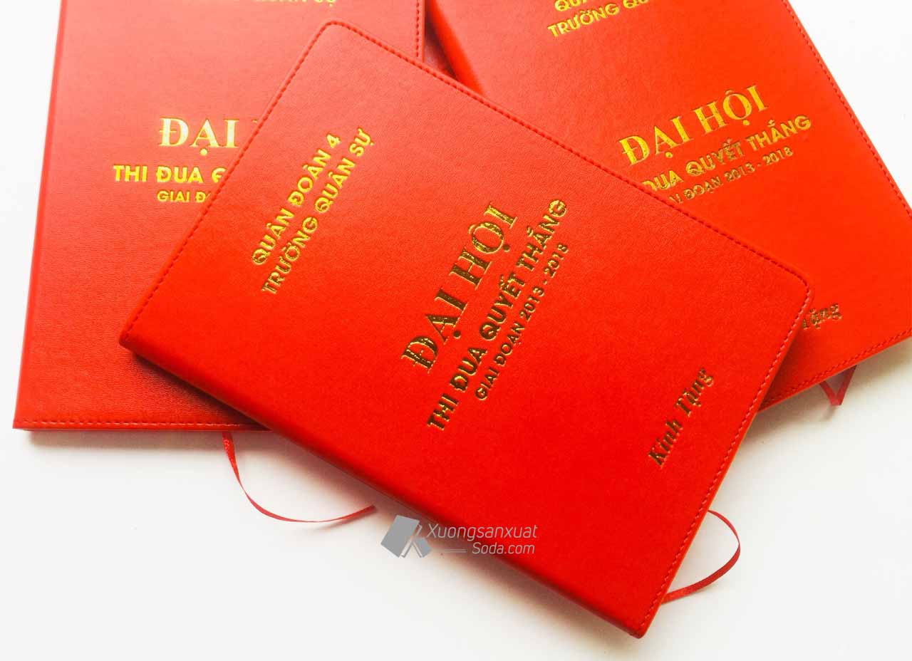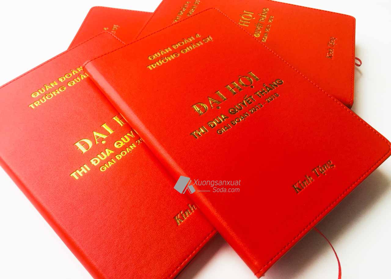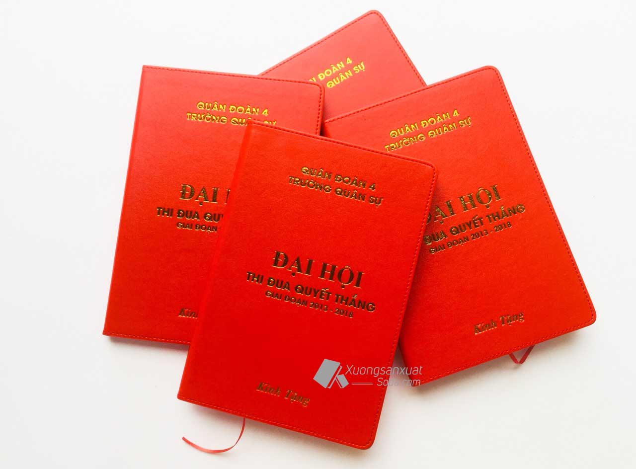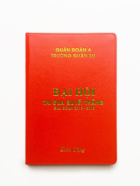 Sổ tay Trường Quân Sự Quân Đoàn 4 ép nhũ vàng 3 vị trí ở bìa sổ, chất lượng ép kim (ép nhũ vàng) khá nét, tươi sáng, đường chỉ may cẩn thận.