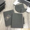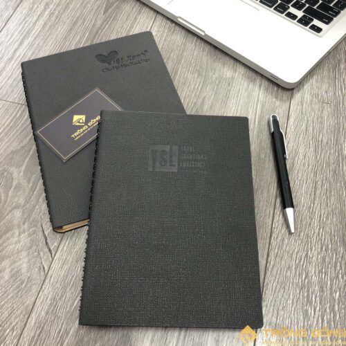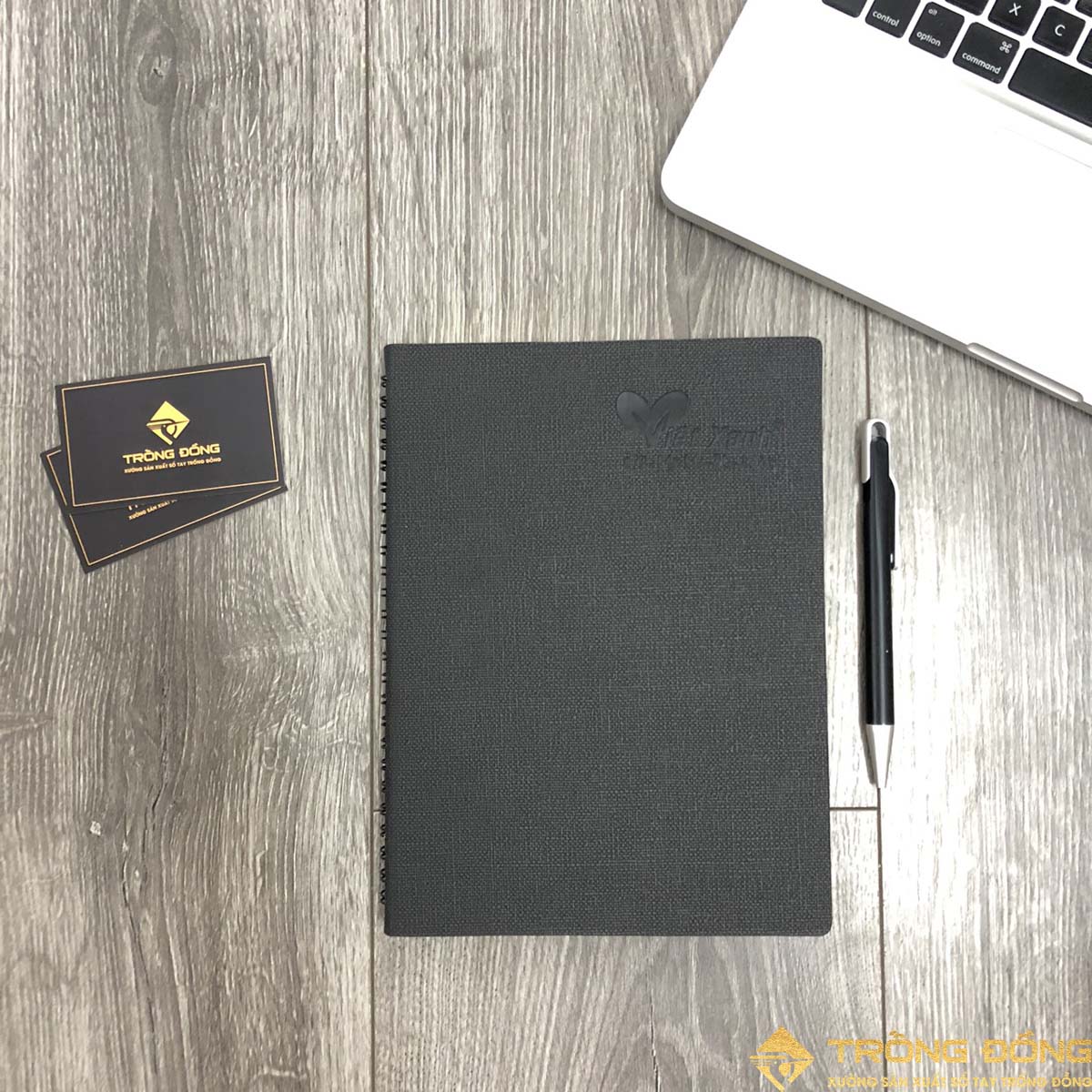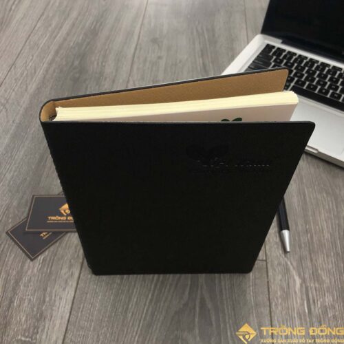 Logo của doanh nghiệp được dập chìm ép nhiệt sang trọng lên bìa da có gân tự nhiên của sổ một cách sang trọng.